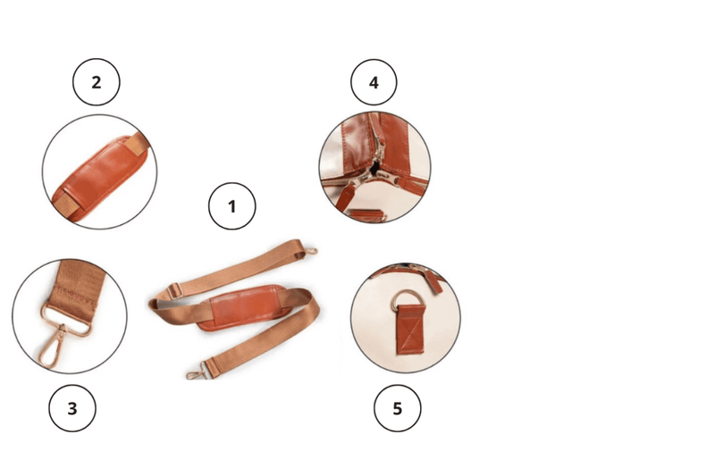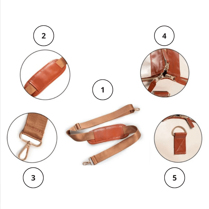 Die robusten und hochwertigen Metallschnallen (3) (5) gewährleisten eine sichere Befestigung, während die glatten und noblen Metallreißverschlüsse ein müheloses Öffnen und Schließen ermöglichen. Diese Details verleihen JeyBag nicht nur eine ansprechende Optik, sondern sorgen auch für eine lange Lebensdauer und Zuverlässigkeit.