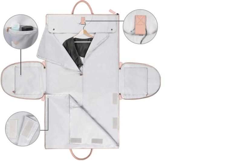 Das Innenfach lässt sich durch einen Reißverschluss öffnen, und die integrierten Kleiderhaken können herausgeklappt werden. Dadurch können Kleidungsstücke während der Reise knitterfrei aufgehängt werden.