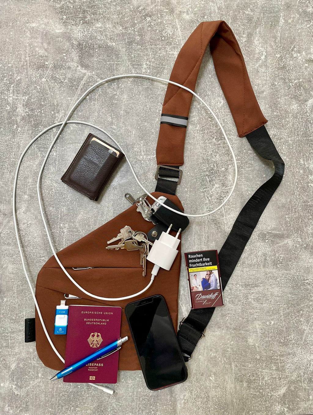 Mit ihrer durchdachten Aufteilung bietet die Tasche genug Platz für Handy, Geldbörse, Schlüssel, Reisepass, Powerbank und vieles mehr. Besonders praktisch ist die Rückentasche mit Reißverschluss, in der Du Deine wertvollsten Gegenstände sicher verstauen kannst.